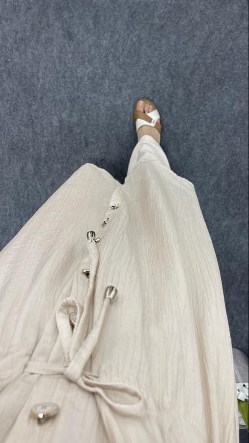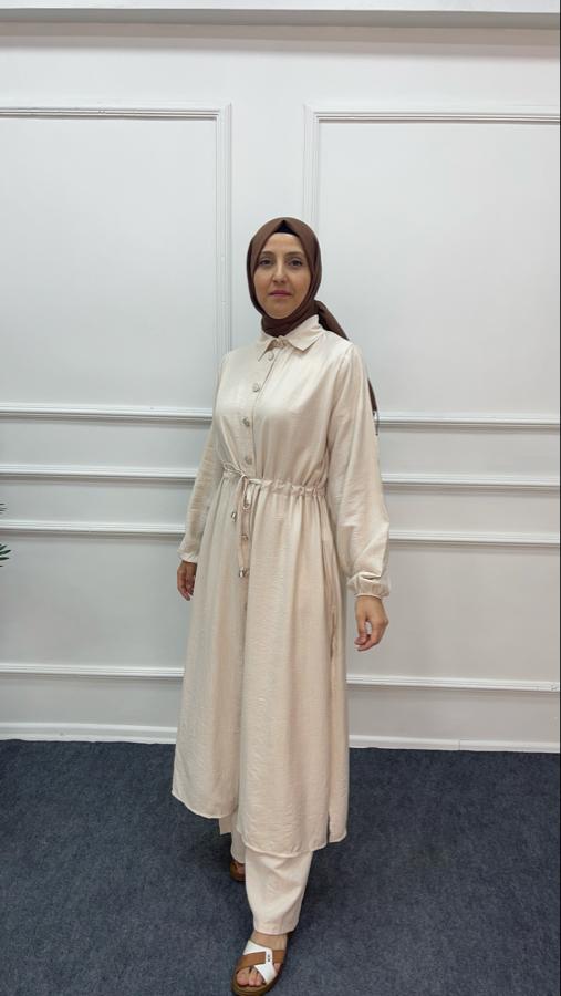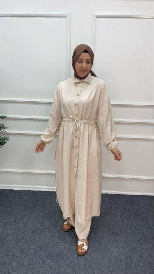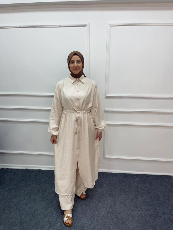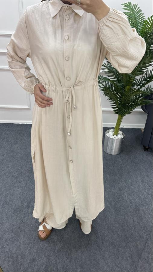 Şıklık ve konforu bir araya getiren bu çilek kumaş takım, günlük kombinlerinizde vazgeçilmeziniz olacak! Hafif ve dökümlü yapısıyla yaz aylarında serin tutar, zarif duruşuyla her ortama uyum sağlar. • Kumaş Türü: Yumuşak dokulu, nefes alabilen çilek kumaş • Takım İçeriği: Düğmeli tunik (belden bağlamalı) ve lastikli bol paça pantolon • Beden Aralığı: M, L, XL, XXL • Kalıp: Geniş ve rahat kalıp, hareket özgürlüğü sunar • Renk Seçenekleri: 5 farklı renk alternatifi • Pantolon: Lastikli beli sayesinde konforlu kullanım Günlük şıklığınızı tamamlamak için bu zarif takımı hemen sepetinize ekleyin!