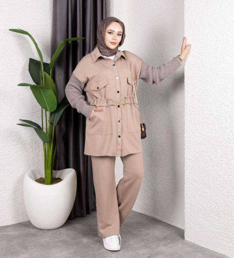 TRİKO KOLLU ÇITÇIT CEKETLİ CAMEL TAKIM